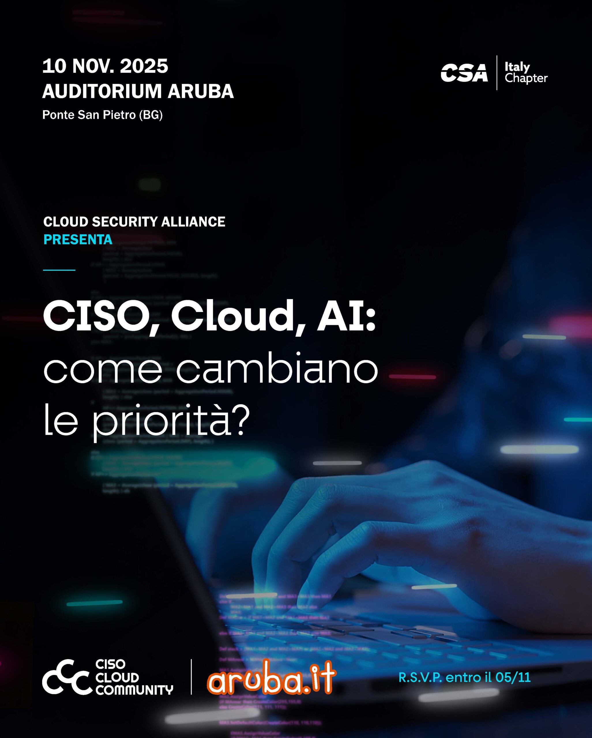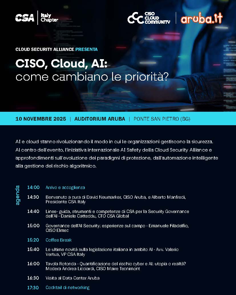 Aruba, provider italiano nel settore cloud e socio corporate di CSA, ospiterà il prossimo 10 novembre presso il proprio Auditorium di Ponte San Pietro, all’interno del Global Cloud Data Center, una giornata di confronto e networking dedicata alla Community dei Chief Information Security Officer (CISO) di CSA Italy. La giornata offrirà un’occasione unica per discutere delle nuove sfide legate alla sicurezza del cloud e all’impatto dell’intelligenza artificiale sui modelli di difesa aziendale.